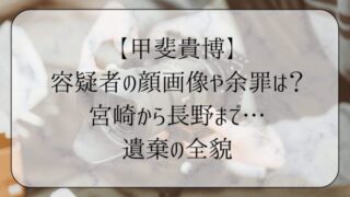 TREND 【甲斐貴博】容疑者の顔画像や余罪は?宮崎から長野まで…遺棄の全貌 現時点で、報道機関による公式な顔画像は公開されていません。宮崎県延岡市から長野県阿南町までは、直線距離でも膨大な隔たりがあります。甲斐容疑者は死体遺棄だけでなく、殺害についてもほのめかす供述を始めています。 2026.04.07 2026.04.08 TREND容疑者